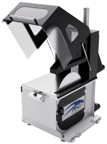 Un convogliatore inferiore raccoglie i trucioli prodotti dalla lama e li porta ad una bocca laterale da collegare all’impianto di aspirazione centrale. Un’ulteriore bocca di aspirazione è presente sul piano di lavoro per recuperare il materiale prodotto dalla rotazione della lama. Su due lati del portellone sono posizionate delle bandelle in plastica a protezione dell’operatore; queste chiudono l’area di pericolo prima della discesa del pressore e la salita della lama. Un cilindro pneumatico, con corsa di 275 mm, permette l’arretramento della macchina in modo automatico quando questa non è utilizzata per il taglio
