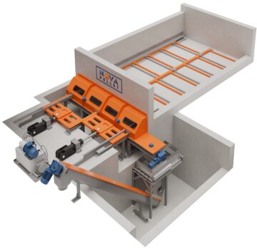 Le système à plancher mobile, développé grâce à l’expérience pluri-décennale de Nova Pellet, est le cœur de la N-WF CONCRETE. Ce système avancé permet l’acheminement efficace du matériau à l’intérieur du bassin vers la bouche de sortie. Le matériau est ensuite évacué par gravité sur un convoyeur à vis de chargement ou un Redler, qui sert d’extracteur et d’alimentateur pour les lignes de production en aval. Le fonctionnement du plancher mobile est piloté par une armoire électrique équipée d’un PLC ou directement par le superviseur centralisé de l’installation, assurant un contrôle précis et fiable de l’ensemble du procédé.